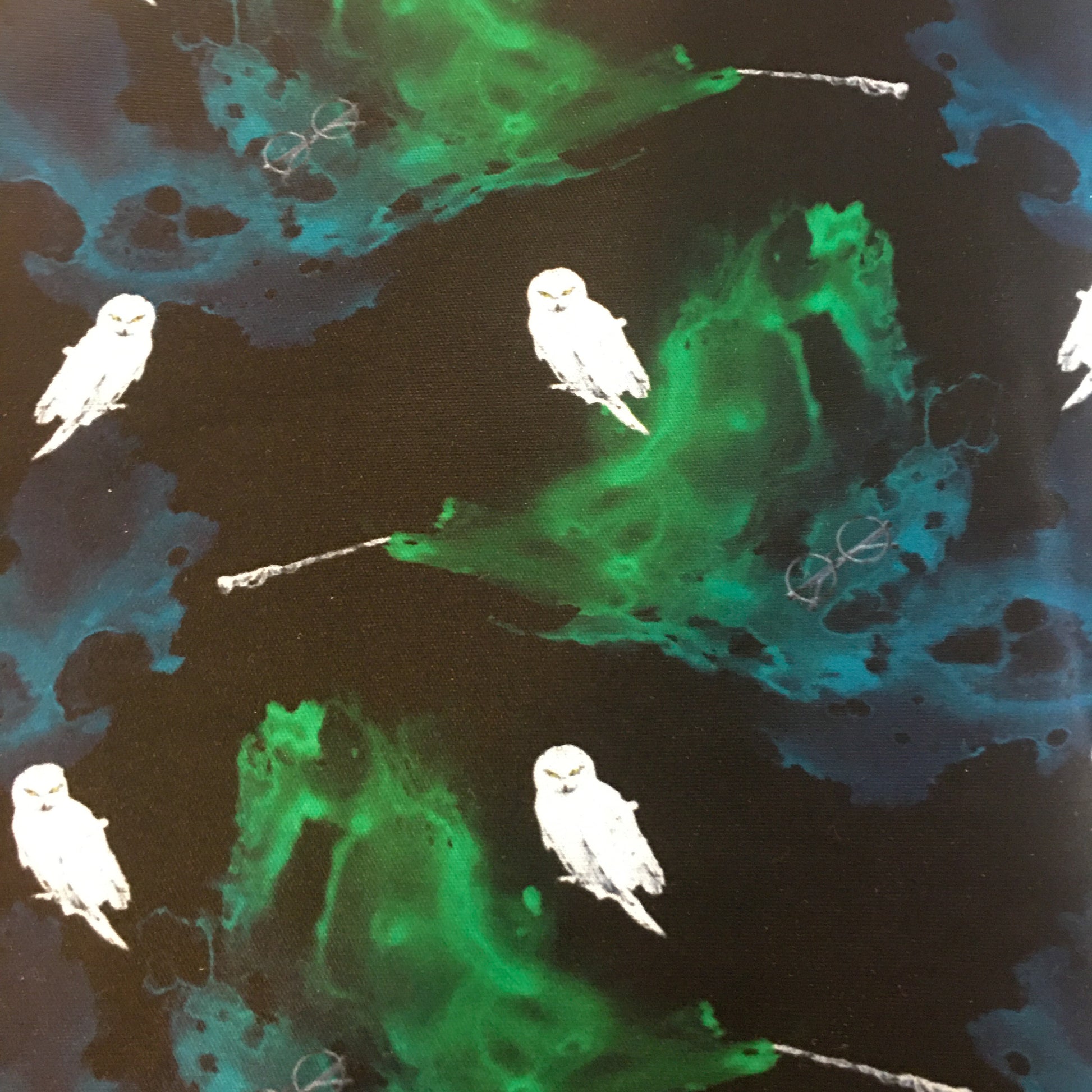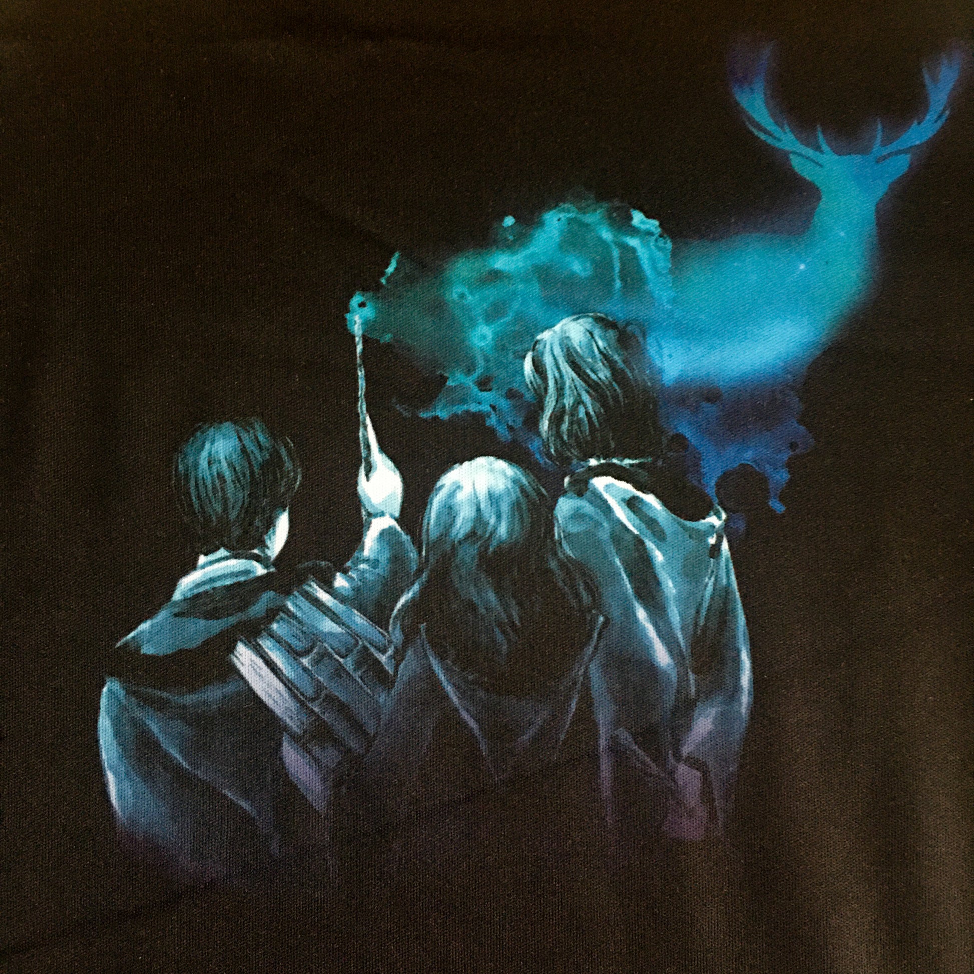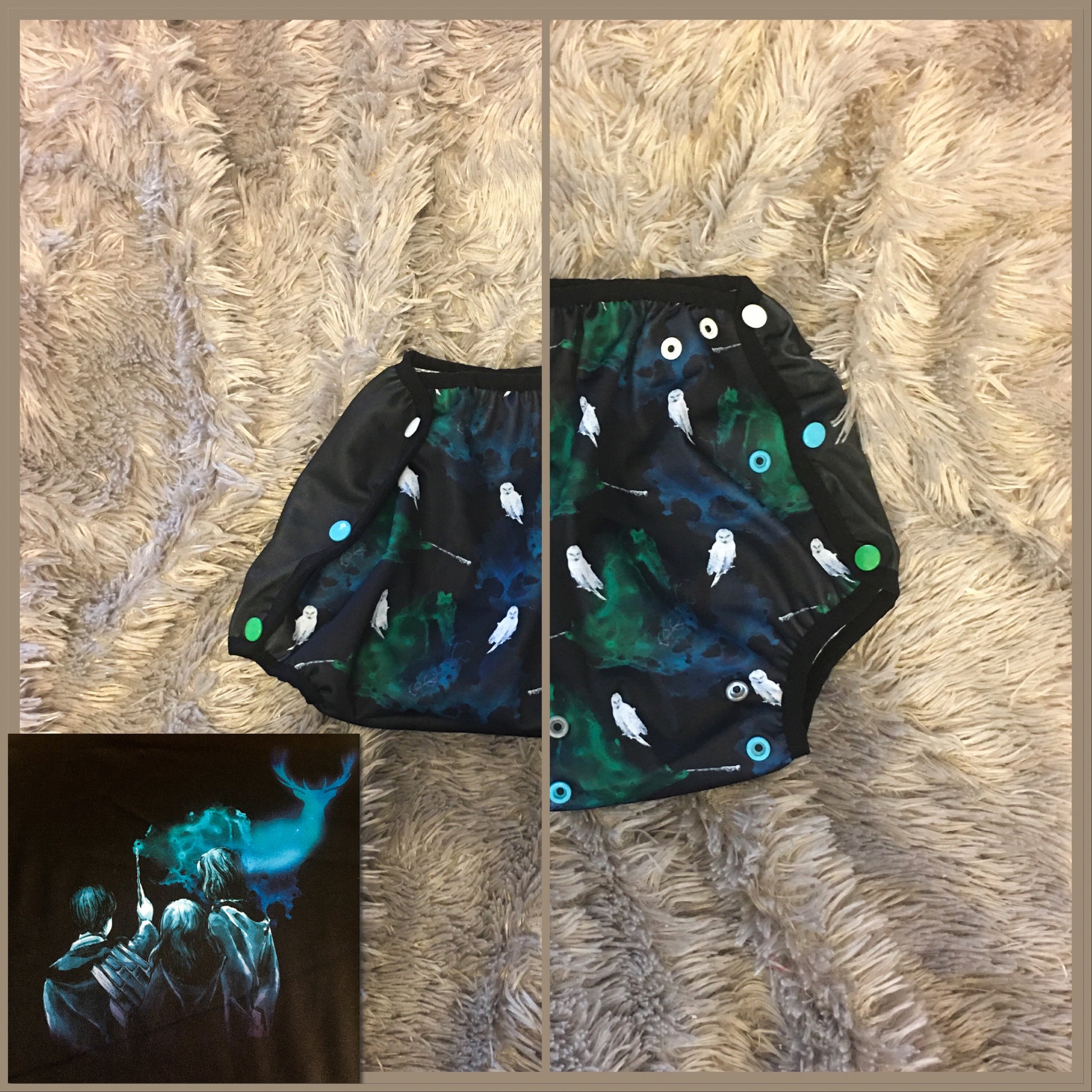 Des chouettes, des lunettes et des baguettes magiques qui jettent des sorts sur le devant,, et trois jeunes sorciers qui lancent un célèbre sortilège au dos !