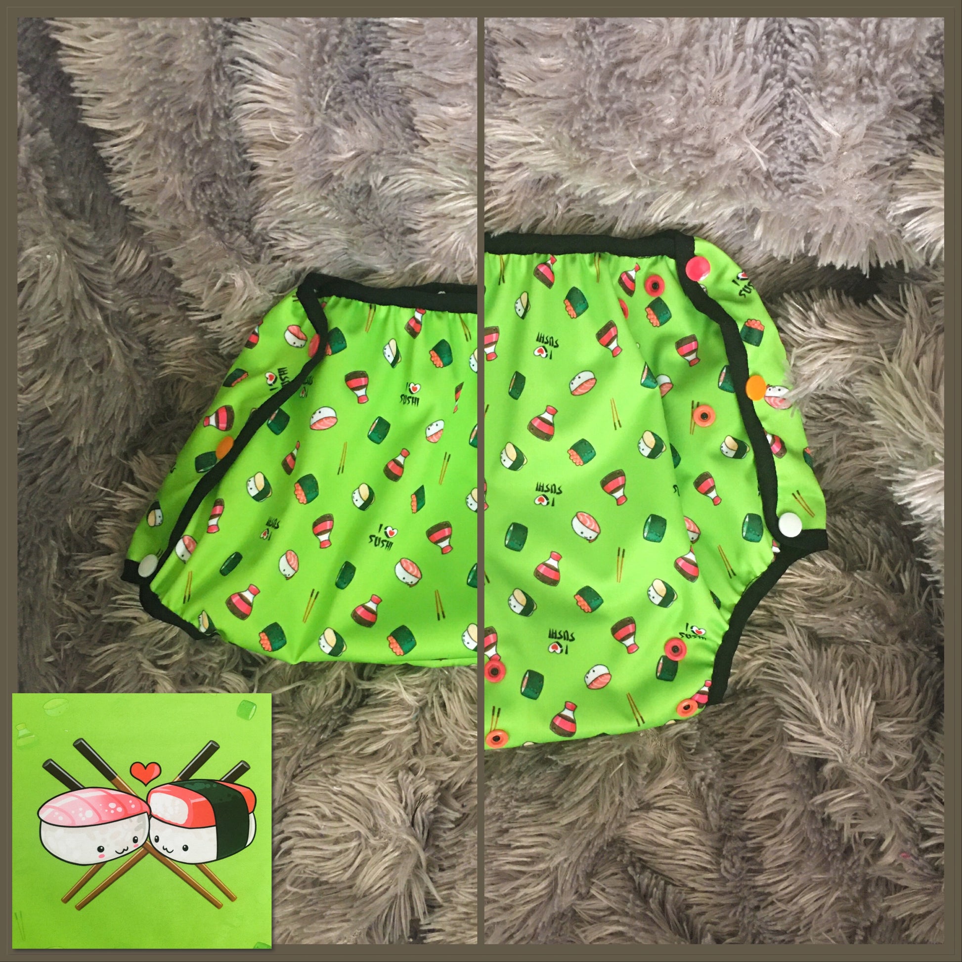 Un bloomer aux couleurs wasabi, recouvert de mini sushis, avec motif placé au dos